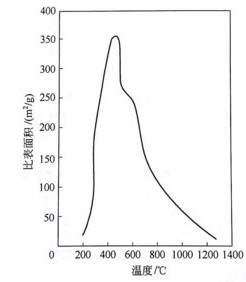 氫氧化鋁在煅燒的過程中比表面積隨溫度的變化如圖,在240℃時比表面積急劇增加,到400℃左右達到極大值。